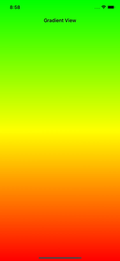 import UIKit class TestController: UIViewController { override func viewDidLoad() { super.viewDidLoad() initialSetup() } private func initialSetup() { // basic setup view.backgroundColor = .white navigationItem.title = "Gradient View" // Create a new gradient layer let gradientLayer = CAGradientLayer() // Set the colors and locations for the gradient layer gradientLayer.colors = [UIColor.green.cgColor, UIColor.yellow.cgColor, UIColor.red.cgColor] gradientLayer.locations = [0.0, 0.5, 1.0] // Set the start and end points for the gradient layer gradientLayer.startPoint = CGPoint(x: 0.0, y: 0.0) gradientLayer.endPoint = CGPoint(x: 0.0, y: 1.0) // Set the frame to the layer gradientLayer.frame = view.frame // Add the gradient layer as a sublayer to the background view view.layer.insertSublayer(gradientLayer, at: 0) } }