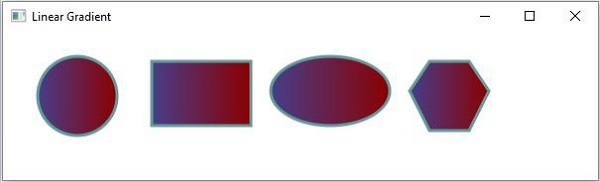JavaFX 中的 javafx.scene.paint.LinearGradient 類是 Paint 的子類,可以使用它用圓形線性漸變圖案填充形狀。