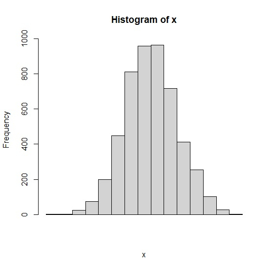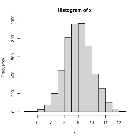 set.seed(1999) x<-rnorm(5000,9,1) hist(x,xaxt='n')