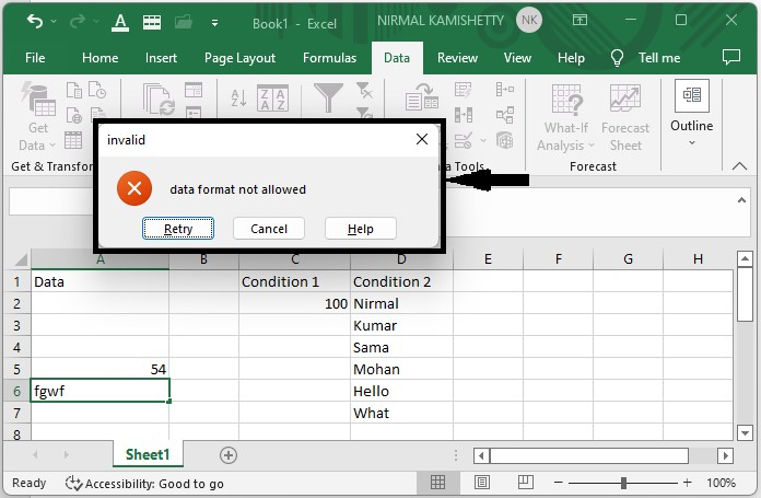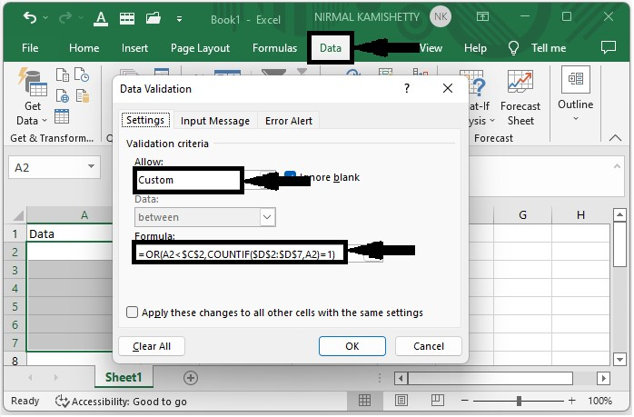 現在要應用資料驗證,選擇要應用資料驗證的單元格範圍,然後單擊“資料”並單擊“資料驗證”,將開啟一個新的彈出視窗,如下面的影像所示。
