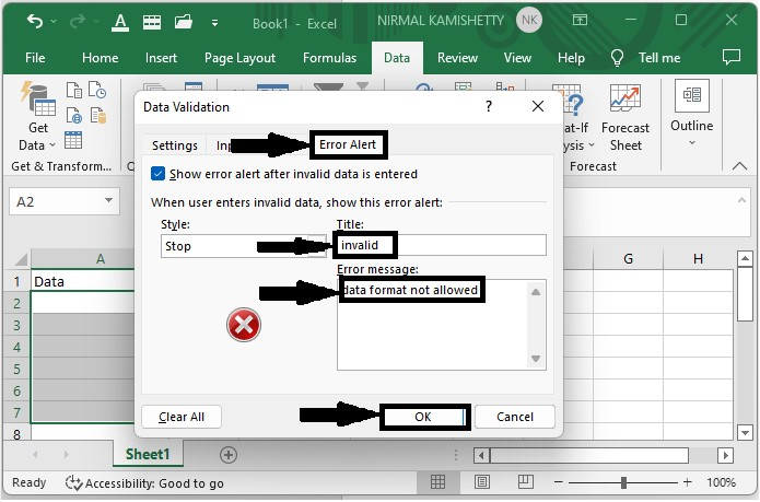 現在要自定義錯誤訊息,請單擊“錯誤警告”,然後將“標題”輸入為“無效”,將“訊息”輸入為“資料格式不允許”,然後單擊“確定”,如下面的螢幕截圖所示。