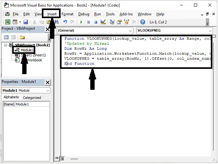 Function VLOOKUPNEG(lookup_value, table_array As Range, col_index_num As Integer, CloseMatch As Boolean) 'Updated by Nirmal Dim RowNr As Long RowNr = Application.WorksheetFunction.Match(lookup_value, table_array.Resize(, 1), CloseMatch) VLOOKUPNEG = table_array(RowNr, 1).Offset(0, col_index_num) End Function