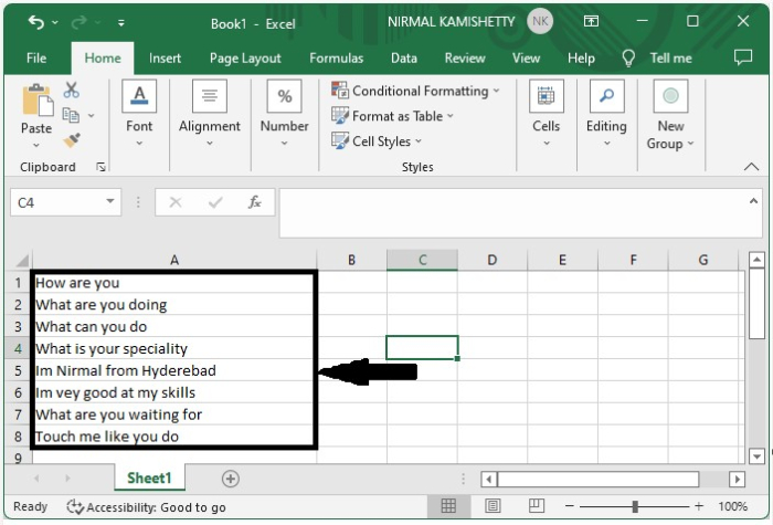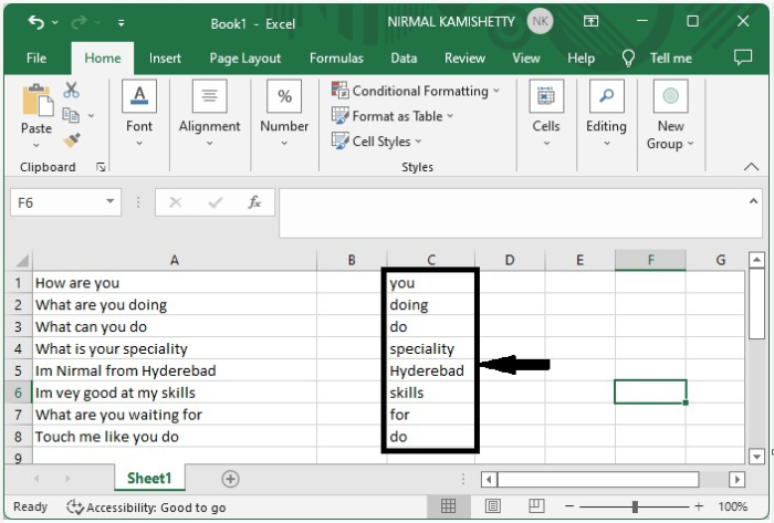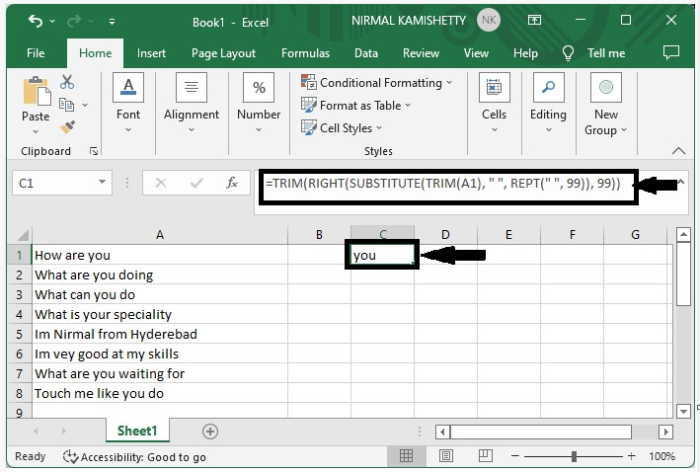 現在點選一個空單元格(在本例中為C2單元格),並在公式框中輸入公式=TRIM(RIGHT(SUBSTITUTE(TRIM(A1), " ", REPT(" ", 99)), 99)),然後點選“Enter”按鈕即可獲得第一個結果,如下圖所示。