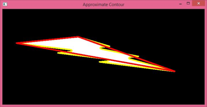 import cv2 import numpy as np # Read the input image img = cv2.imread('approx1.png') # convert the image to grayscale gray = cv2.cvtColor(img, cv2.COLOR_BGR2GRAY) # apply thresholding to convert the grayscale image to a binary image ret,thresh = cv2.threshold(gray,150,255,0) # find the contours contours,hierarchy = cv2.findContours(thresh, cv2.RETR_TREE,cv2.CHAIN_APPROX_SIMPLE) print("Number of contours detected:",len(contours)) # take first contour cnt = contours[0] # define the precision epsilon = 0.01*cv2.arcLength(cnt,True) # approximate the contour approx = cv2.approxPolyDP(cnt,epsilon,True) # draw the contour on the input image cv2.drawContours(img, [cnt], -1, (0,255,255), 3) # draw the approximate contour on the input image cv2.drawContours(img, [approx], -1, (0,0,255), 3) # display the image with drawn contours and approximate contours cv2.imshow("Approximate Contour", img) cv2.waitKey(0) cv2.destroyAllWindows()