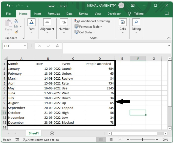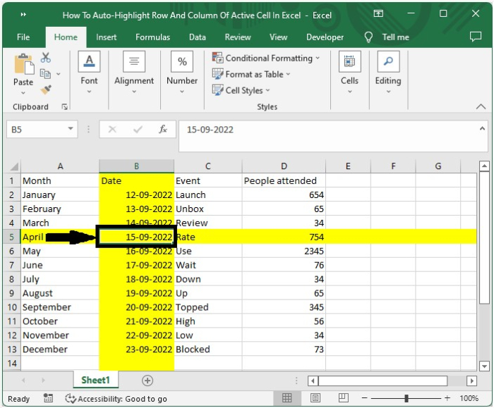 現在將工作表另存為啟用宏的工作表,然後按“Alt + Q”關閉 VBA 應用程式。每次單擊 Excel 中的單元格時,都會突出顯示該單元格的行和列,如下圖所示。