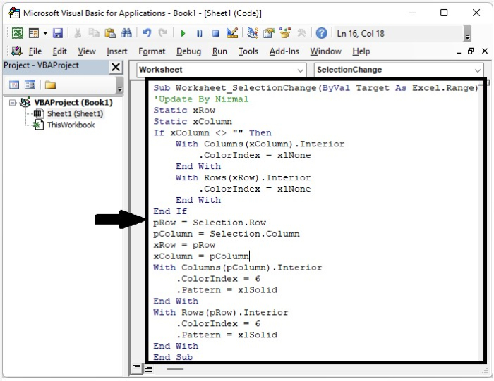 Sub Worksheet_SelectionChange(ByVal Target As Excel.Range) 'Update By Nirmal Static xRow Static xColumn If xColumn <> "" Then With Columns(xColumn).Interior .ColorIndex = xlNone End With With Rows(xRow).Interior .ColorIndex = xlNone End With End If pRow = Selection.Row pColumn = Selection.Column xRow = pRow xColumn = pColumn With Columns(pColumn).Interior .ColorIndex = 6 .Pattern = xlSolid End With With Rows(pRow).Interior .ColorIndex = 6 .Pattern = xlSolid End With End Sub