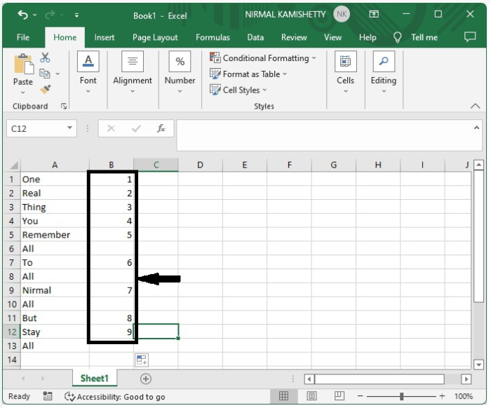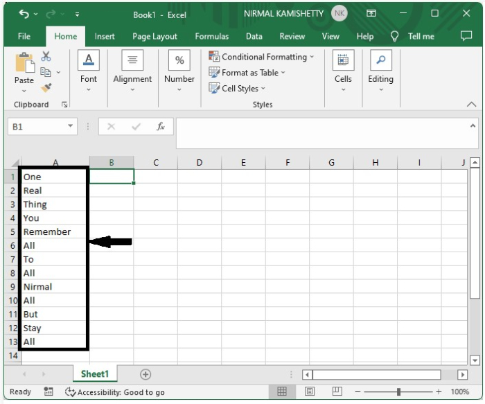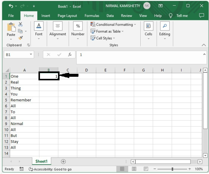 現在單擊第一個結果旁邊的單元格,即單元格B1,並在其中輸入1。如果排除的專案存在於單元格A1中,則在單元格B2中輸入1,如下圖所示。