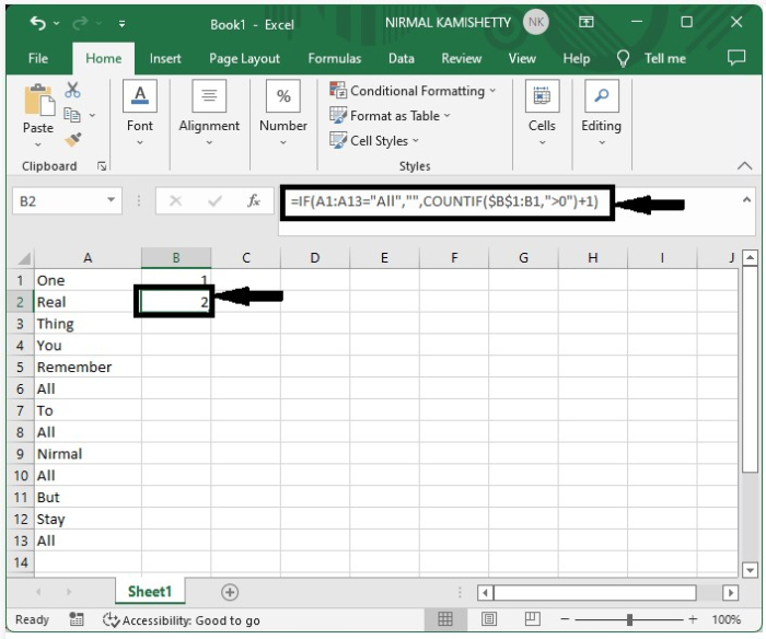 =IF(A1:A13="All","",COUNTIF($B$1:B1,">0")+1) 在公式框中,然後單擊Enter以獲得第一個結果,如下圖所示。