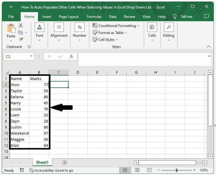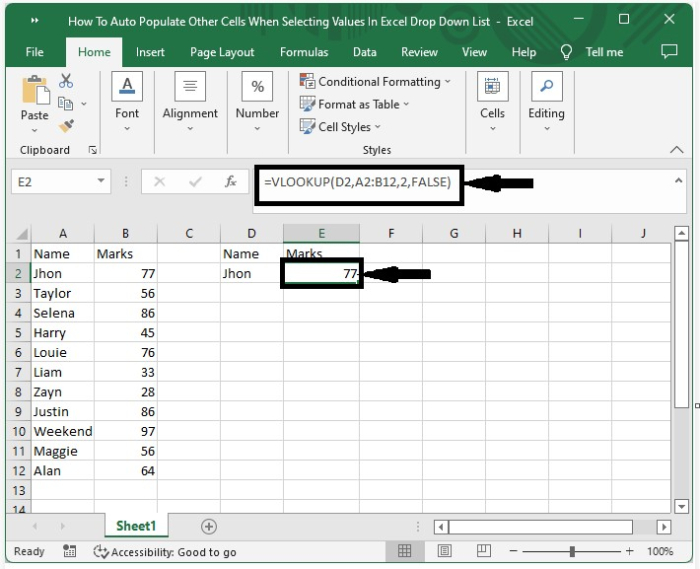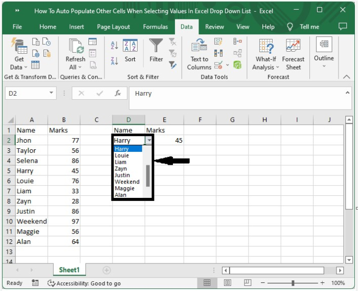 在這裡,我們將首先使用 VLOOKUP 函式獲取分數列表,然後為姓名建立資料驗證列表。讓我們來看一個簡單的過程,以瞭解如何在 Excel 中從下拉列表中選擇值時自動填充其他單元格。