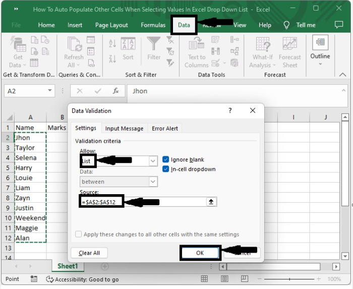 在新彈出的視窗中,選擇“允許列表”和“來源為:單元格 A2 到 A12”,然後點選“確定”即可成功獲取我們的下拉列表,從中我們將能夠確定單元格 E2 的值。