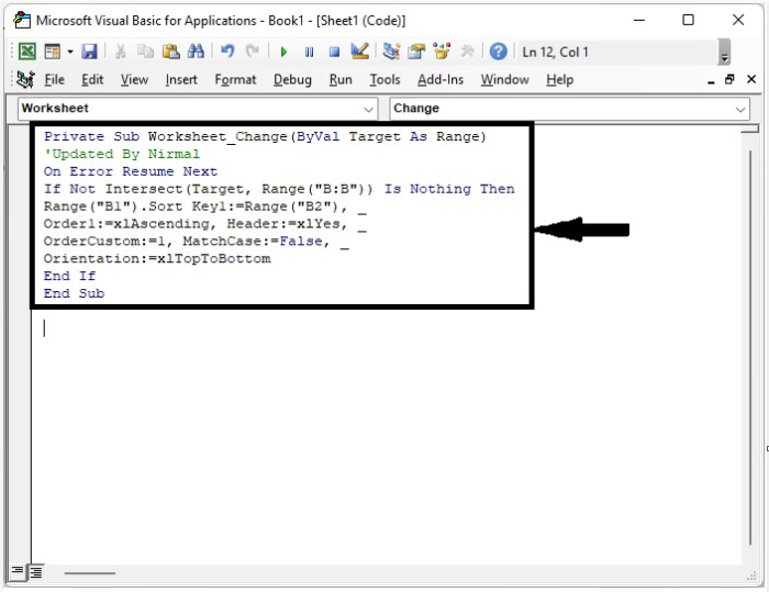 Private Sub Worksheet_Change(ByVal Target As Range) 'Updated By Nirmal On Error Resume Next If Not Intersect(Target, Range("B:B")) Is Nothing Then Range("B1").Sort Key1:=Range("B2"), _ Order1:=xlAscending, Header:=xlYes, _ OrderCustom:=1, MatchCase:=False, _ Orientation:=xlTopToBottom End If End Sub