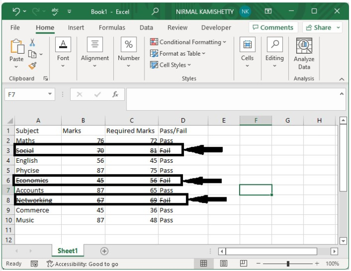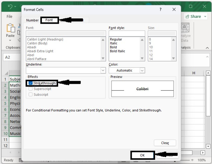 在這裡,我們將使用條件格式,並在字型下選擇刪除線字型。讓我們來看一個簡單的過程,瞭解如何在 Excel 中根據單元格值自動新增刪除線。
