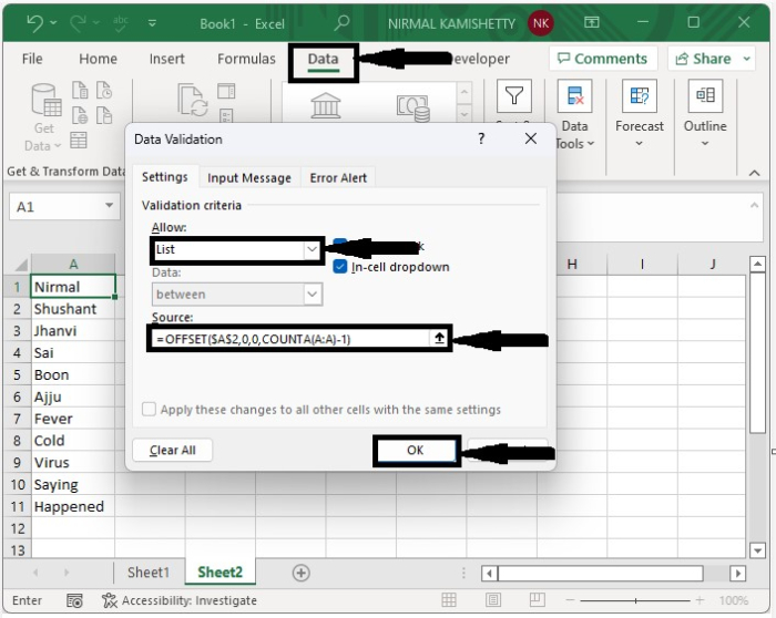 現在要建立自動更新的下拉列表,請單擊單元格並單擊“資料驗證”,然後在彈出列表中,選擇“允許”並在“來源”文字框中輸入公式=OFFSET($A$2,0,0,COUNTA(A:A)-1),然後單擊“確定”。