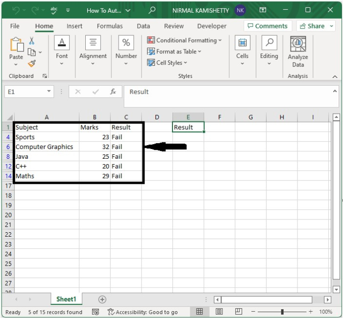 現在將工作表另存為啟用宏的工作表,並使用命令“Alt + Q”關閉 vba 應用程式,當您從單元格“E1”中點選 Enter 時,資料將自動篩選,如下面的影像所示。