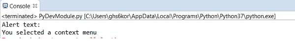 from selenium import webdriver from selenium.webdriver.common.action_chains import ActionChains from selenium.webdriver.common.alert import Alert #set chromodriver.exe path driver = webdriver.Chrome(executable_path="C:\chromedriver.exe") driver.implicitly_wait(0.5) #launch URL driver.get("https://the-internet.herokuapp.com/context_menu") #object of ActionChains a = ActionChains(driver) #identify element m = driver.find_element_by_id("hot-spot") #move mouse over element a.move_to_element(m) #perform right-click a.context_click().perform() #switch to alert al = driver.switch_to.alert #get alert text s = al.text print("Alert text: ") print(s) #accept alert al.accept() #close browser driver.quit()