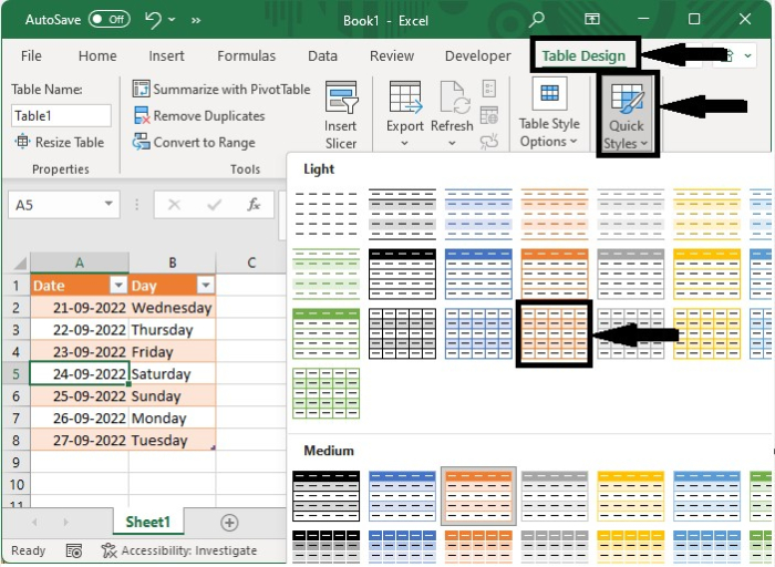 現在單擊表格中的任何單元格,然後單擊“表格設計”並選擇“快速樣式”下的任何樣式,如下面的影像所示。如果您看不到交替顏色,請在“表格樣式選項”下選擇“帶狀行”。