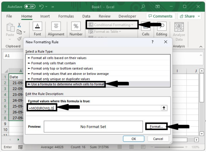 讓我們考慮與上面示例中使用的相同資料。現在單擊“開始”下的“條件格式”,然後選擇“新建規則”以開啟一個彈出視窗。在彈出視窗中,單擊“使用公式確定要格式化的單元格”,然後輸入公式=MOD(ROW(),2),然後單擊“格式”。