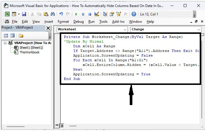 在這裡,我們將插入工作表用於完成此任務的 VBA 程式碼。讓我們來看一下根據日期自動隱藏列的簡單過程。