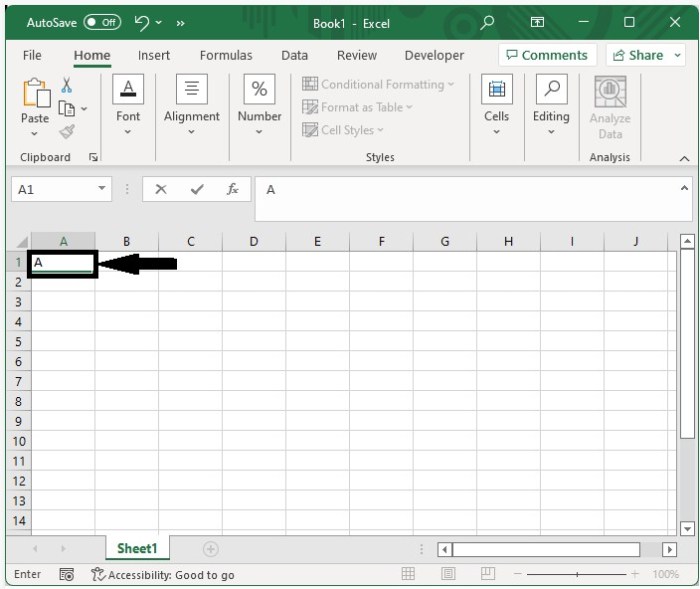 讓我們考慮一個新的Excel工作表,並輸入如下所示的第一個字元。