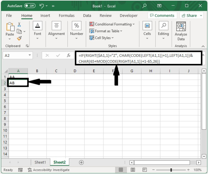 現在單擊下面的單元格,並將公式輸入為 =IF(RIGHT($A1,1)="Z",CHAR(CODE(LEFT(A1,1))+1),LEFT(A1,1))&CHAR(65+MOD(CODE(RIGHT(A1,1))+1-65,26))到公式框中,然後按Enter鍵以獲得我們的第一個結果。