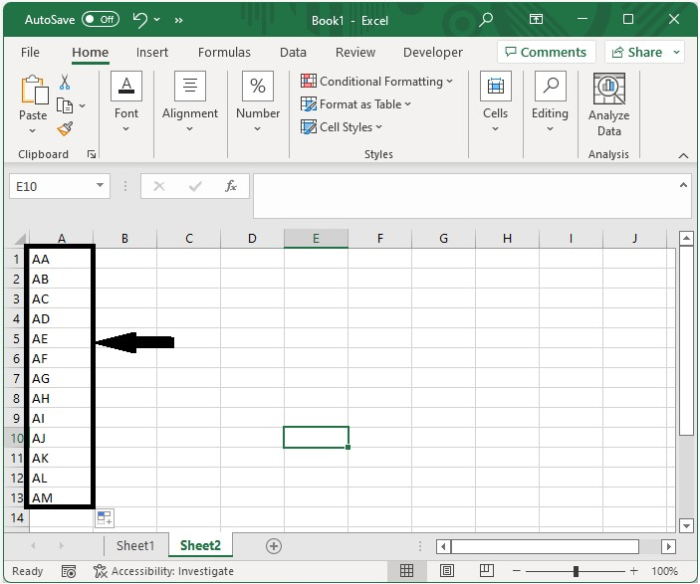 在這裡,我們將在第一個單元格中輸入“AA”,使用公式,並使用自動填充柄來完成任務。讓我們來看一個輕鬆的過程,瞭解如何在Excel中自動將字母遞增1以獲得多個字元組合的下一個字母。