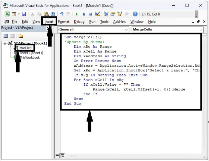 在這裡,我們將插入一個 VBA 模組,然後執行它來完成我們的任務。讓我們看看一個簡單的過程來了解如何使用 VBA 程式碼在 Excel 中自動合併上方空白單元格。