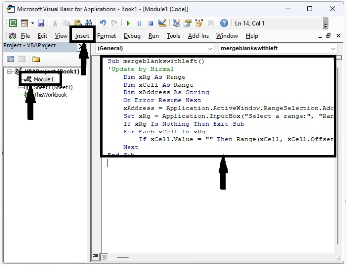 在這裡,我們將插入 VBA 模組,然後執行它來完成我們的任務。讓我們看看一個簡單的過程來了解如何使用 VBA 程式碼自動合併 Excel 中的空白單元格(左側)。