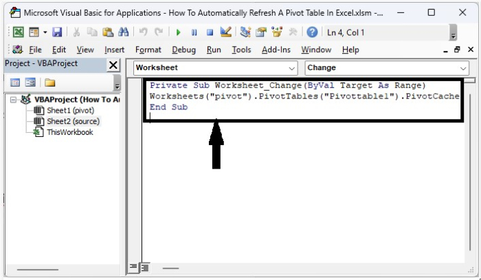 現在我們嘗試將新資料插入到源資料中,但它不會在資料透視表中更新。為此,右鍵單擊源資料工作表名稱並選擇“檢視程式碼”以開啟 VBA 應用程式,然後將程式鍵入文字框中,如下圖所示。