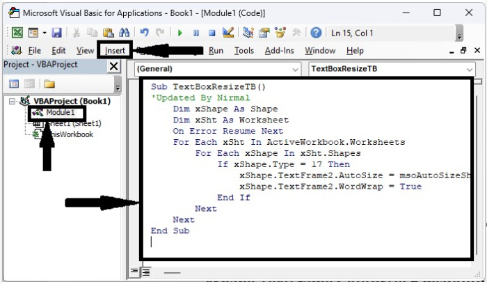 在這裡,我們將首先插入一個 VBA 模組,然後執行它來完成我們的任務。讓我們來看一個輕鬆的過程,瞭解如何自動調整文字框大小以適應 Excel 中的內容。