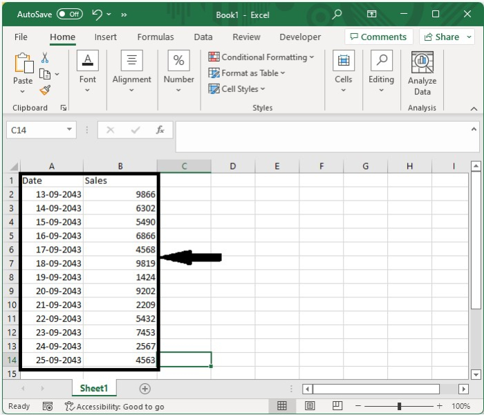 假設一個 Excel 表格包含日期和銷售額列表,如下面的圖片所示。