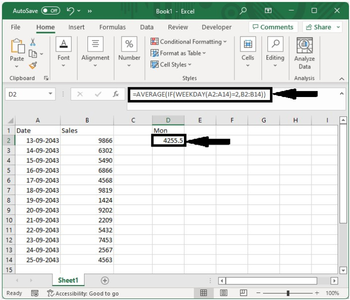 考慮與上一個示例相同的資料,並輸入公式 =AVERAGE(IF(WEEKDAY(A2:A14,2)=1,2,3,4,5,B2:B14)) 並按“CTRL+SHIFT+ENTER”獲取下圖所示的結果。