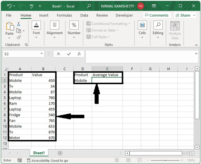 在這裡,我們將透過匹配單元格值來計算平均值。讓我們來看一個簡單的過程,瞭解如何根據單個條件計算平均值,這可以透過使用公式來完成。