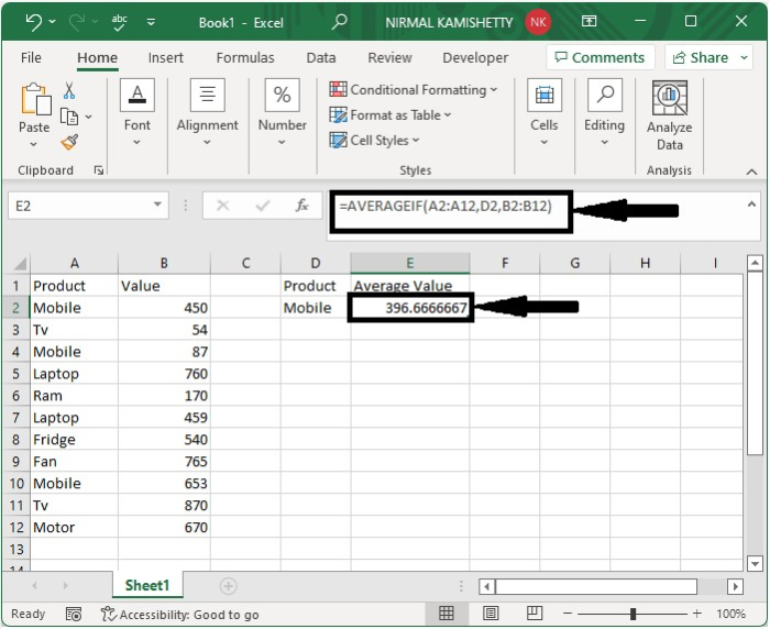 現在,在空單元格中輸入公式 **=AVERAGEIF(A2:A12,D2, B2:B12)** 並按回車鍵即可得到如下所示的結果。在公式中,**A2:A12** 是產品的範圍,**B2:B12** 是值的範圍,**D2** 是包含條件的單元格地址。