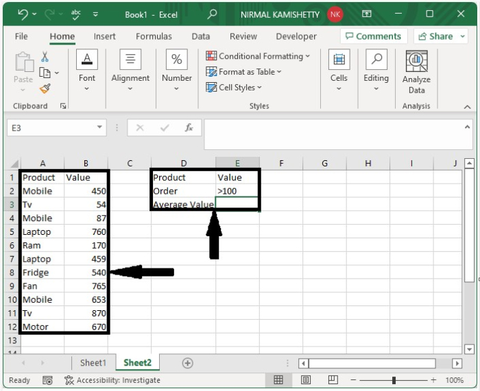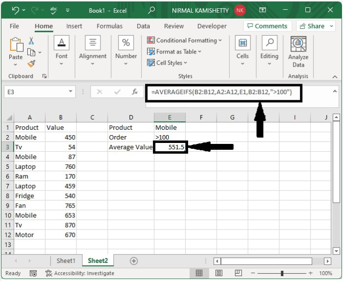 在本節中,我們將根據單元格值計算平均值。讓我們來看一個簡單的過程,瞭解如何根據多個條件計算平均值,這可以透過使用公式來完成。