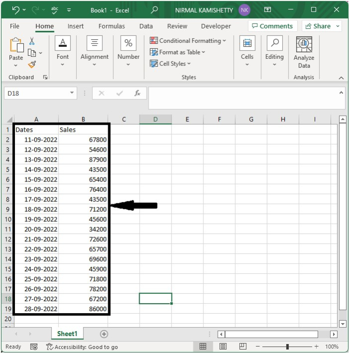 讓我們考慮一個Excel電子表格,其中資料類似於下圖所示的資料。