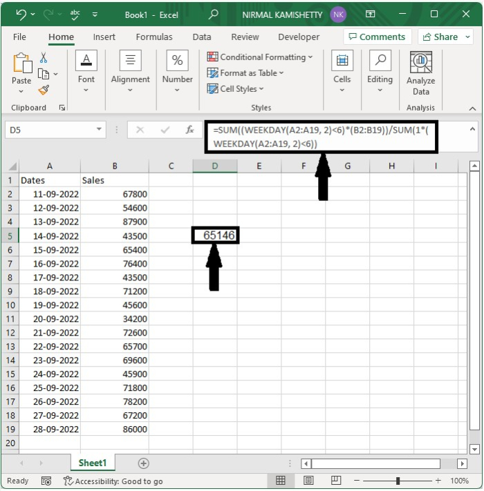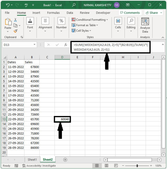 讓我們考慮上面示例中使用的資料,然後點選一個空單元格並輸入公式=SUM((WEEKDAY(A2:A19, 2)>5)*(B2:B19))/SUM(1*(WEEKDAY(A2:A19, 2)>5)),然後點選確定以獲取結果。在公式中,大於5的天數為星期六和星期日。