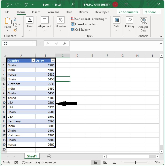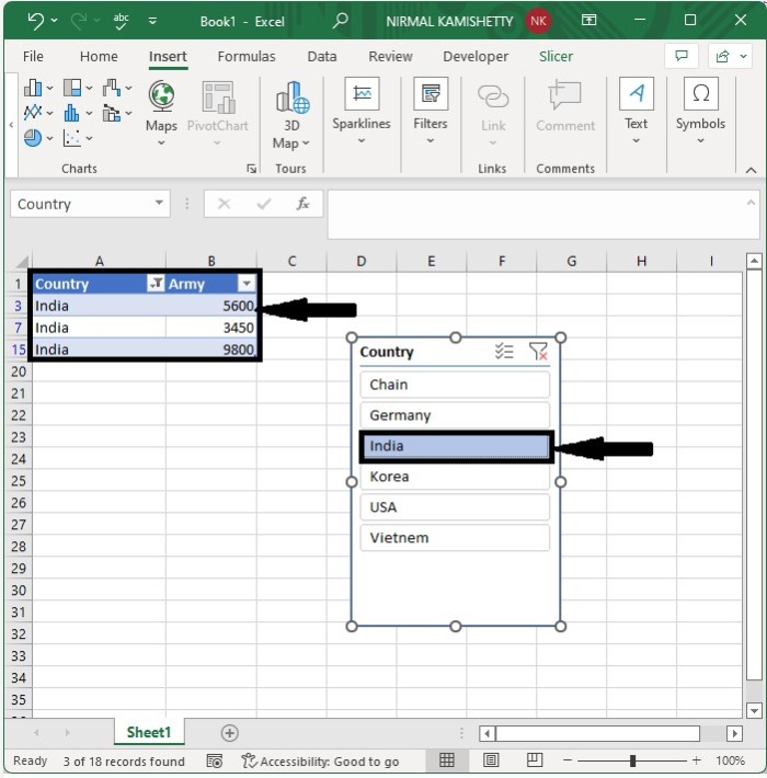 然後單擊切片器中的任何按鈕以應用篩選器,列表將被篩選,結果將類似於下圖。我們將根據國家/地區(印度)進行篩選。