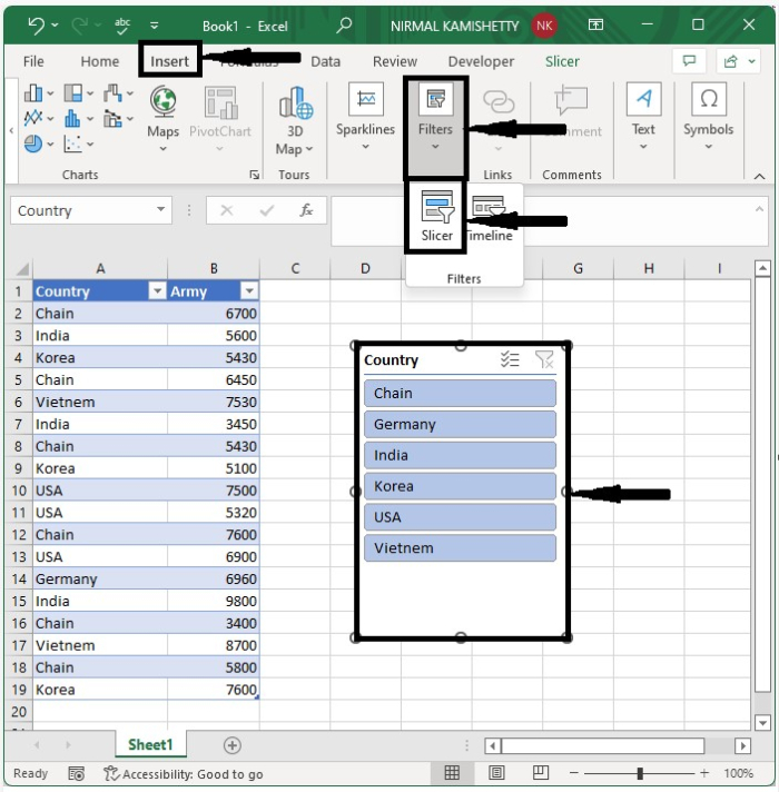 現在要應用篩選器,請單擊“插入”,然後在篩選器下選擇“切片器”。然後,切片器將被插入到工作表中,如下圖所示。