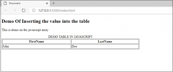 <!DOCTYPE html> <html lang="en"> <head> <meta charset="UTF-8"> <meta name="viewport" content="width=device-width, initialscale=1.0"> <title>Document</title> <link rel="stylesheet" href="//code.jquery.com/ui/1.12.1/themes/base/jquery-ui.css"> <script src="https://code.jquery.com/jquery-1.12.4.js"></script> <script src="https://code.jquery.com/ui/1.12.1/jquery-ui.js"></script> <link rel="stylesheet" href="https://cdnjs.cloudflare.com/ajax/libs/fontawesome/4.7.0/css/font-awesome.min.css"> </head> <body> <h2>Demo Of Inserting the value into the table</h2> <p>This is demo on the javascript array</p> <p id="demo"></p> <script> var index = 0; var firstNameArray = new Array(); var lastNameArray = new Array(); var firstName = ""; var lastName = ""; while (!(firstName == null || lastName == null)) { firstName = prompt("Please Enter your First Name="); lastName = prompt("Please Enter your Last Name="); firstNameArray[index] = firstName; lastNameArray[index] = lastName; index++; } document.writeln("<table border='1' width='50%'>"); document.writeln("<caption>DEMO TABLE IN JAVASCRIPT</caption>"); document.writeln("<th>FirstName</th><th>LastName</th>"); for (var startIndex in firstNameArray) { if (firstNameArray[startIndex] !== null && lastNameArray[startIndex] !== null) document.writeln("<tr><td>" + firstNameArray[startIndex] + "</td><td>" + lastNameArray[startIndex] + "</td></tr>"); } document.write("</table>"); </script> </body> </html>