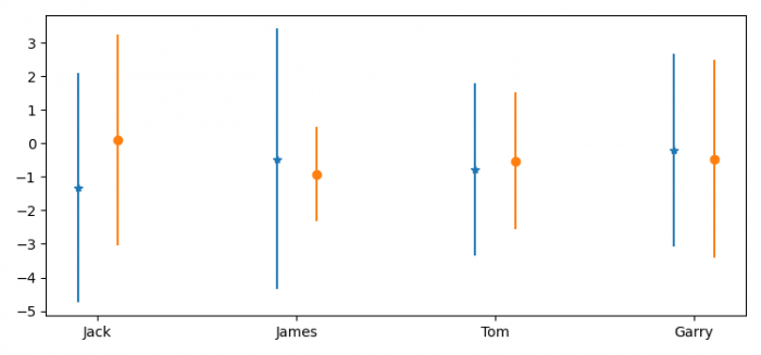 import numpy as np import matplotlib.pyplot as plt from matplotlib.transforms import Affine2D plt.rcParams["figure.figsize"] = [7.50, 3.50] plt.rcParams["figure.autolayout"] = True x = ['Jack', 'James', 'Tom', 'Garry'] y1, y2 = np.random.randn(2, len(x)) ye1, ye2 = np.random.rand(2, len(x))*4+0.3 fig, ax = plt.subplots() trans1 = Affine2D().translate(-0.1, 0.0) + ax.transData trans2 = Affine2D().translate(0.1, 0.0) + ax.transData er1 = ax.errorbar(x, y1, yerr=ye1, marker="*", linestyle="none", transform=trans1) er2 = ax.errorbar(x, y2, yerr=ye2, marker="o", linestyle="none", transform=trans2) plt.show()