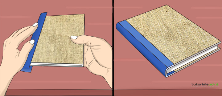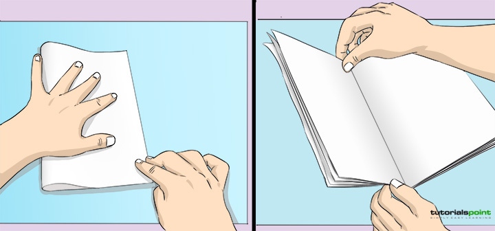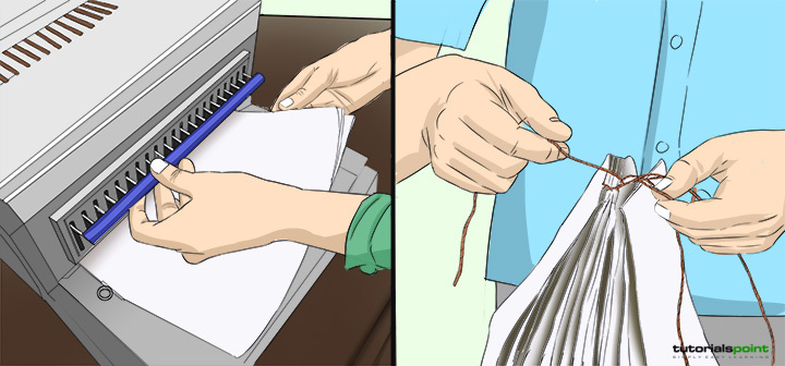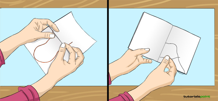 將頁面一張疊在另一張上後,沿長度方向對摺,在書上做一個摺痕。展開紙張時,應做一個與先前摺痕垂直的第二個摺痕。之後,翻轉頁面,然後使用鋸齒形縫線將它們縫合在一起,每次縫合之間暫停約一英寸。縫線必須穿過摺痕以及頁面。