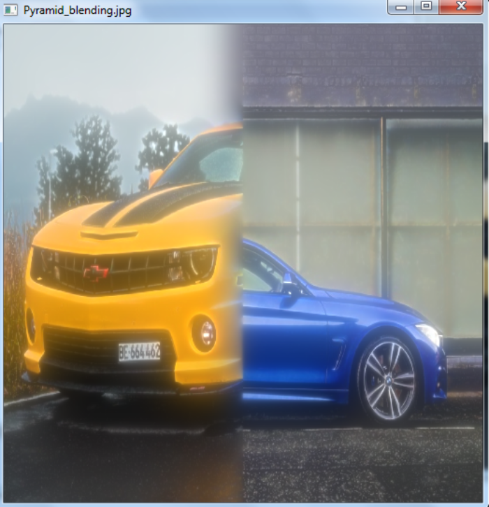 import cv2 import numpy as np,sys A = cv2.imread('car.jpg') B = cv2.imread('blue-car.jpg') A = cv2.resize(A, (512, 512)) B = cv2.resize(B, (512, 512)) # generate Gaussian pyramid for A G = A.copy() gpA = [G] for i in range(6): G = cv2.pyrDown(G) gpA.append(G) # generate Gaussian pyramid for B G = B.copy() gpB = [G] for i in range(6): G = cv2.pyrDown(G) gpB.append(G) # generate Laplacian Pyramid for A lpA = [gpA[5]] for i in range(5,0,-1): GE = cv2.pyrUp(gpA[i]) L = cv2.subtract(gpA[i-1],GE) lpA.append(L) # generate Laplacian Pyramid for B lpB = [gpB[5]] for i in range(5,0,-1): GE = cv2.pyrUp(gpB[i]) L = cv2.subtract(gpB[i-1],GE) lpB.append(L) # Now add left and right halves of images in each level LS = [] for la,lb in zip(lpA,lpB): rows,cols,dpt = la.shape ls = np.hstack((la[:,0:cols//2], lb[:,cols//2:])) LS.append(ls) # now reconstruct ls_ = LS[0] for i in range(1,6): ls_ = cv2.pyrUp(ls_) ls_ = cv2.add(ls_, LS[i]) # image with direct connecting each half real = np.hstack((A[:,:cols//2],B[:,cols//2:])) cv2.imshow('Pyramid_blending.jpg',ls_) cv2.waitKey(0) cv2.imshow('Direct_blending.jpg',real) cv2.waitKey(0) cv2.destroyAllWindows()