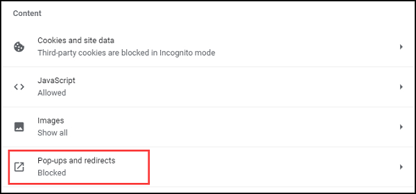 向下滾動,並在**內容**下,點選**彈出視窗和重定向**。