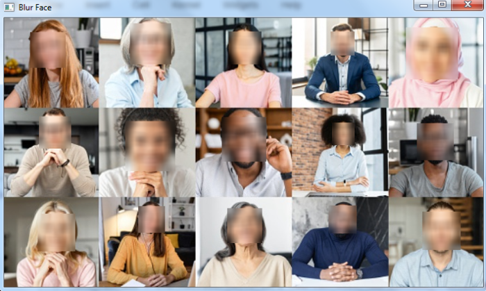 並且我們將獲得以下視窗,顯示輸入影像中模糊的面部。請注意,所有 15 張面部大小都不同。所有不同的面部都已模糊。