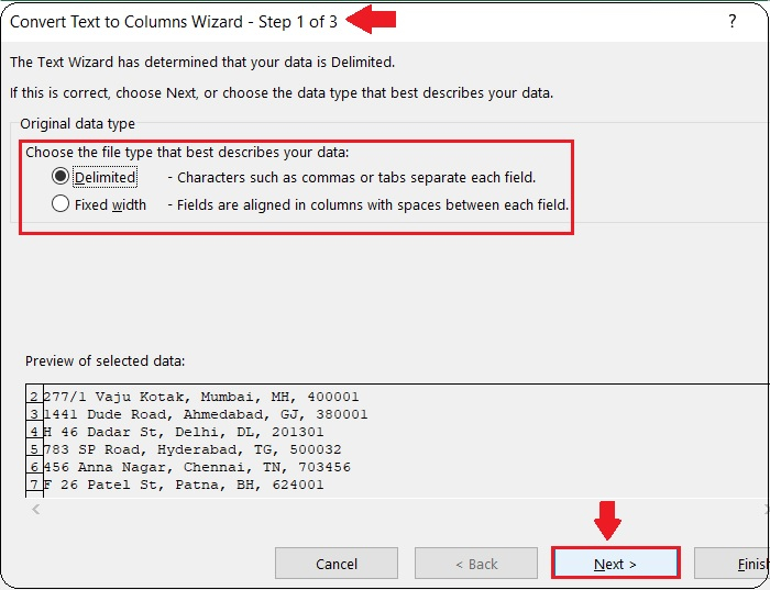 之後,“將文字轉換為列嚮導-步驟1/3”對話框出現。現在,在原始資料型別下選擇“分隔符”選項,然後在做出選擇後單擊“下一步”按鈕。請參考下面的螢幕截圖。
