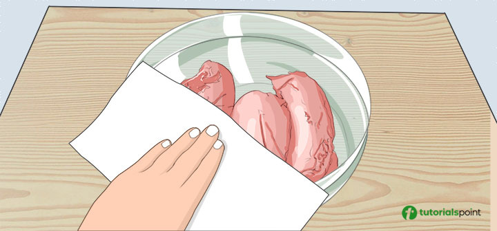 步驟 5 − 將雞胸肉從醃料中取出,丟棄醃料。用紙巾將雞肉拍幹。