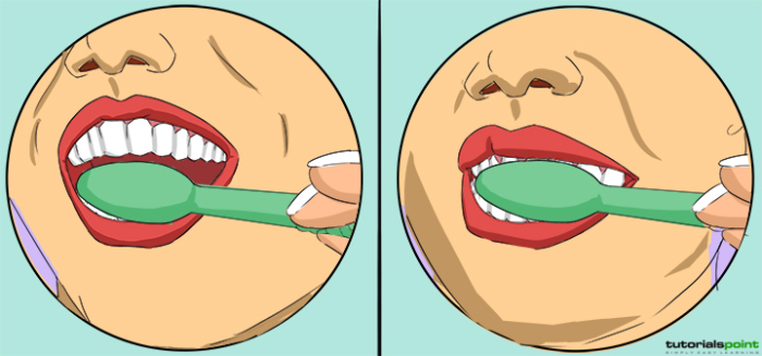 一個牙刷可以同時覆蓋 2 或 3 顆牙齒。刷子的位置與牙齒水平相符。需要對彎曲的刷毛施加一點壓力。圓形刷牙動作首先覆蓋上前面部。然後是下前面部。重複短而圓的運動 60 秒,上排 30 秒,下排 30 秒。
