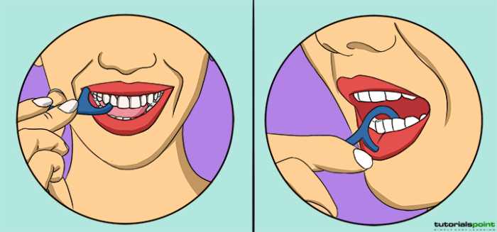 握住牙線,每隻手一端。使用拇指和食指。輕輕地將其滑入牙齒之間。將牙線彎曲到牙齒周圍。對不同的牙齒重複此過程。避免傷害牙齦。因此,刷子無法到達的食物殘渣被清除。