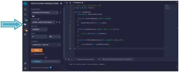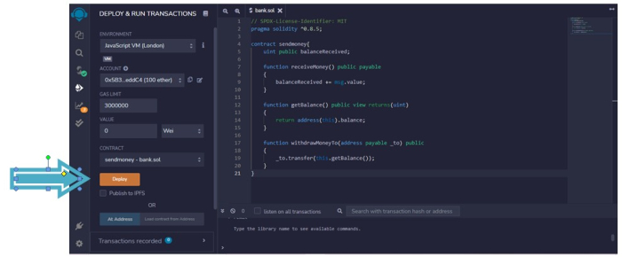 **步驟 5** - 編譯後,應在網路上部署此智慧合約以使用 Remix 自身提供的本地網路進行正確檢查,該網路使用基於 JavaScript 的內部瀏覽器支援的本地網路。**點選部署和交易**。