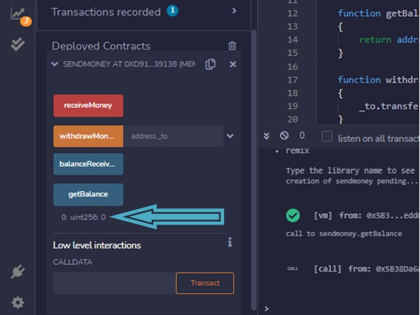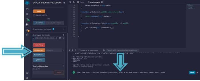 部署合約後,我們將在**終端上獲得輸出**,我們還可以注意到我們的賬戶中也扣除了某些代幣**(倒數第二張圖片)**。如果我們向下滾動左側欄,我們還將獲得用於在不同賬戶之間進行交易的操作的**事件選項卡**,這不過是我們智慧合約程式中建立的函式。